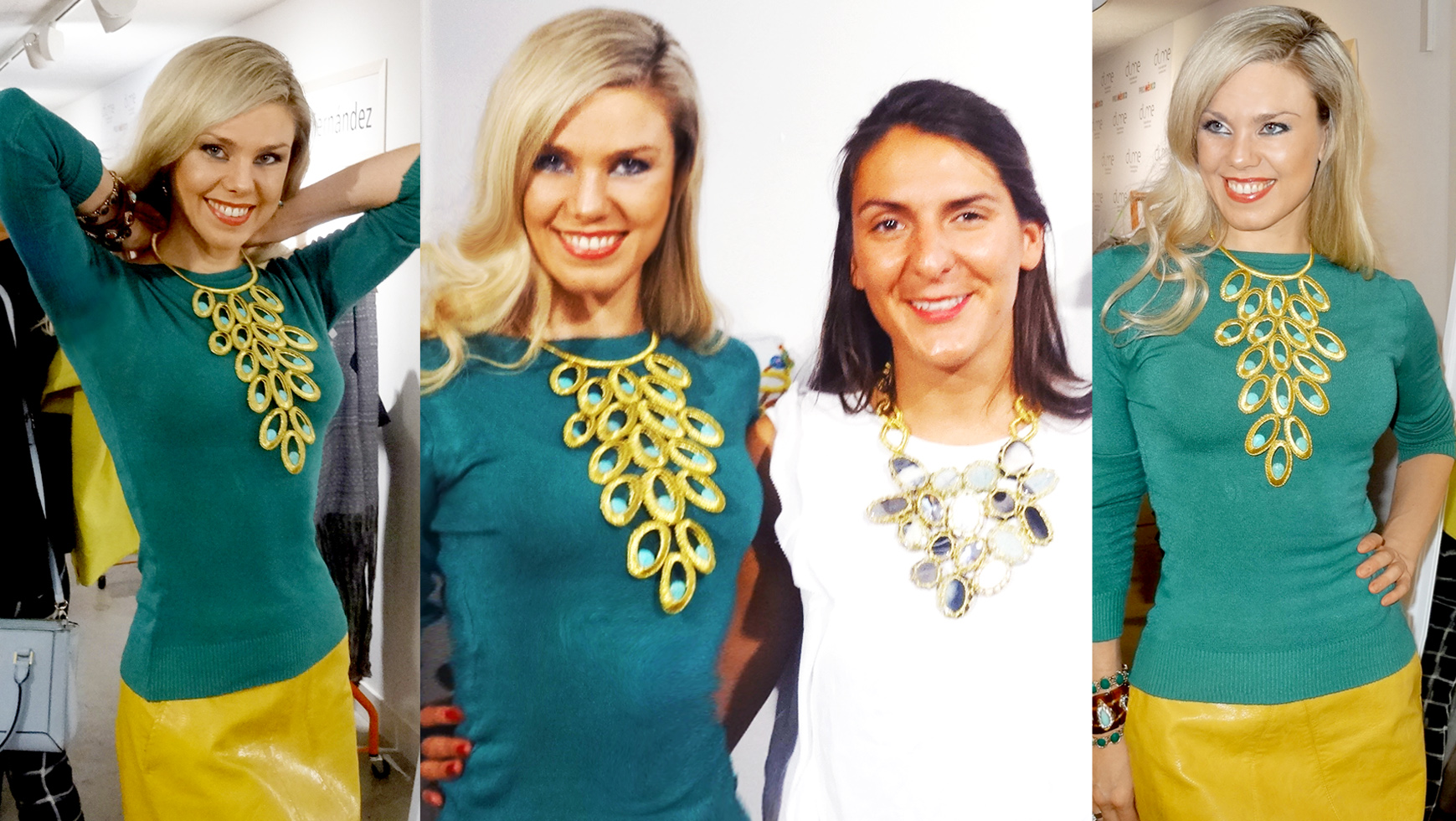 The design of BOKS&BAUM jewelry couture reflects the elegance of Parisian fashion, but the production is handcrafted in the Mexico City workshop. The story behind the golden silk thread comes from the fact that the designer was allergic to the metal fitting, so she found an unconventional solution by fitting those gems into a hand-crafted thread fitting. Not only does it look absolutely unique but it is also pleasant to wear, because the jewelry feels very light considering the amount of the gems in it. Bulle Decastille, the brand manager, (pictured above) gave me a chance to develop a strong bond between me and that golden blue necklace (my favorite mix of the colours!). That necklace likes me a lot, so I returned the admiration.